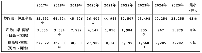 2017年8月から潮岬南部で始まった黒潮大蛇行(※1,※2)は、水産物の生産量に影響を与えたと言われている。しかし、伊豆半島は黒潮大蛇行の開始点(潮岬南部)から距離があり(※1,※2)、大蛇行が強く影響を与えていたかは不明瞭である。実際、2017年からの最小生産量と最大生産量を比較すると、最小生産量/最大生産量は43%であり(表1)、「和歌山県・南部」や「徳島県・南部」といった黒潮大蛇行の影響が強い地域程は減産していない。減産開始時期も2017年からであり(図1)、大蛇行開始点に近い「和歌山県・南部」や「徳島県・南部」よりも早く減産している(和歌山県・南部:2020年〜、徳島県・南部:2021年〜)。この為、伊豆産テングサの生産量変化は別要因が影響している可能性がある。特に、西伊豆海域より東伊豆海域の方が黒潮大蛇行の開始点(潮岬南部)から距離がある為、その可能性が高い。