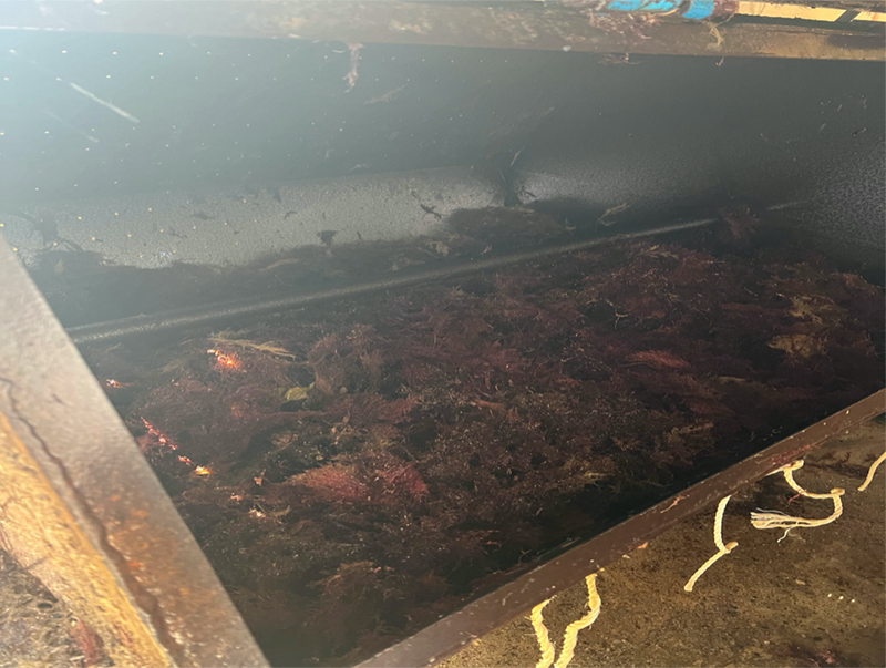 釜出しされた抽出液には天草の残渣が多く混在しています。