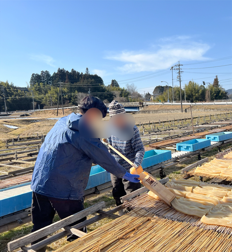 半日かけて固まり、固まったものをマンガ(巨大ところてん切断機)と呼ばれているもので切り出します。