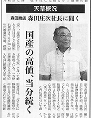 出展された寒天は100点であり、1次審査でゼリー強度、融点、粘度、灰分など物性試験をして点数をつけ何点かを選抜、更に2次審査で製品の形状、光沢等を点数で加点する。結果、優秀賞4点、優良賞4点が選定され表彰をうけた。今年は暖冬であったが、展示されたものはいずれも上品な美しさを持っていた。そのなかで表彰を受けた品は手触り、光沢、形状はさらに上をいく製品であった。
