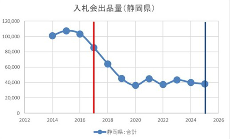 伊豆産テングサ第1回入札会(静岡県第1回入札会)が昨年と同じく3月上旬(3月5日)に開催された。本入札会は全国でも最初に開催される入札会でもあり、今後の相場に影響を与える重要な入札会である。出品量は5,723kgで、昨年同時期と比較して111%と増産した(2025年第1回出品量5,136kg)。ただ、今回出品されるテングサの内、8割を占める仁科産テングサは昨年(2025年)採取されたテングサで、実際に生育量が増加したかは不明である。