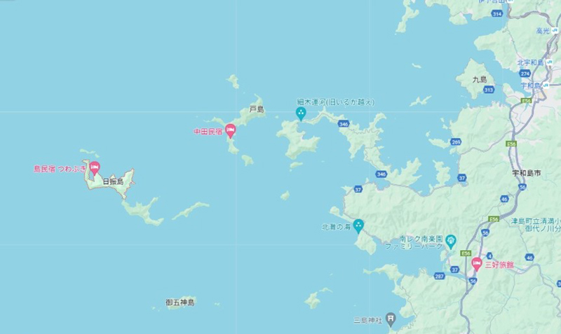 松山→100分(高速道路)→宇和島→50分(フェリー)→日振島